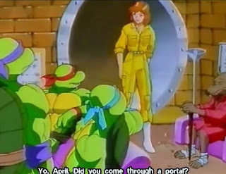 April comes in and Raph ask if April use a portal right after finishing the broadcast. She answer by telling him the footage was pre-recorded. Gee, was Krang on that space shuttle pre-recorded message or something?